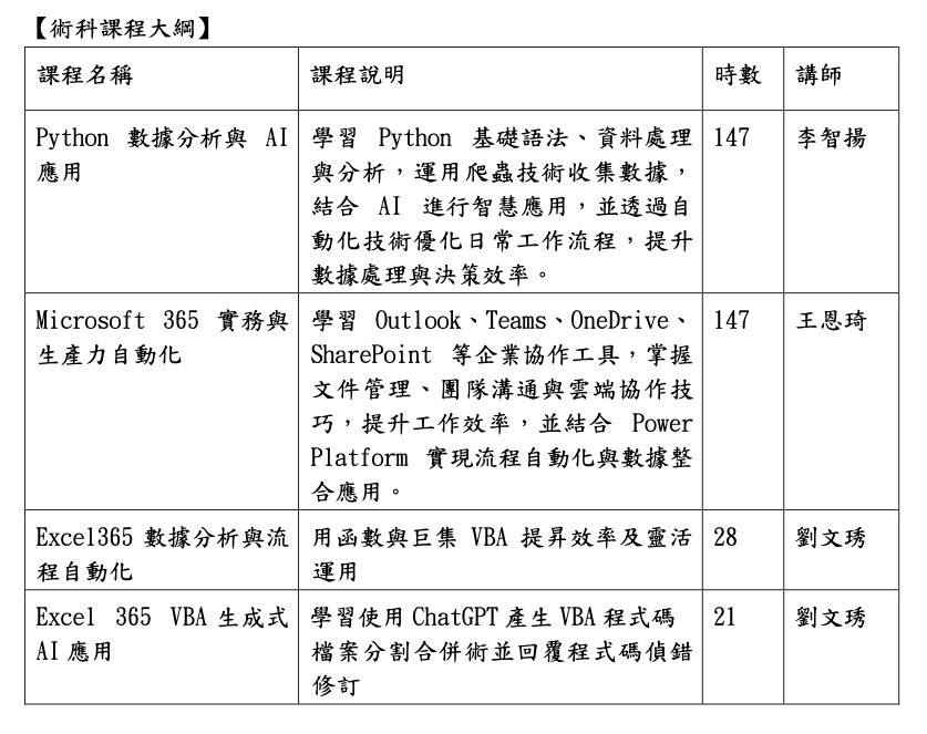 6. 熟悉資料庫管理與 SQL 操作:學會資料查詢、表單設計、JOIN 操作等技術,提升資料處理與分析能力與 Power BI 結合業務流程整合應用。 7. 探索 AI 與生成式 AI 的應用:理解 ChatGPT 及生成式 AI 在文件處理、數據分析、圖片生成等領域的應用,學習如何將 AI 技術整合至日常 工作與商業決策中。